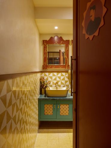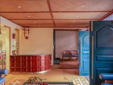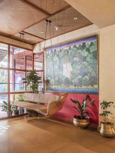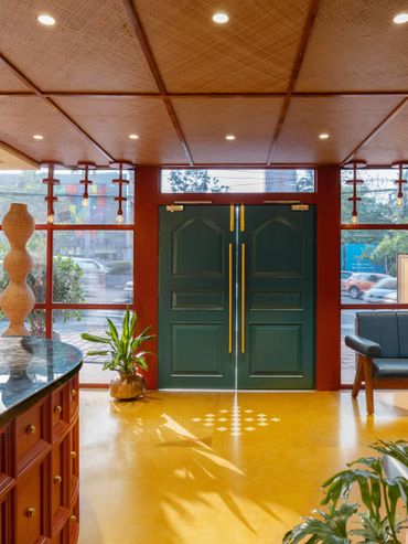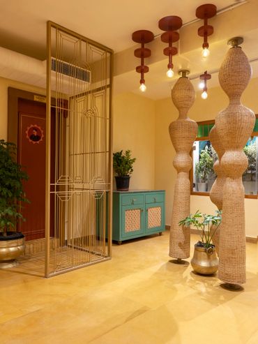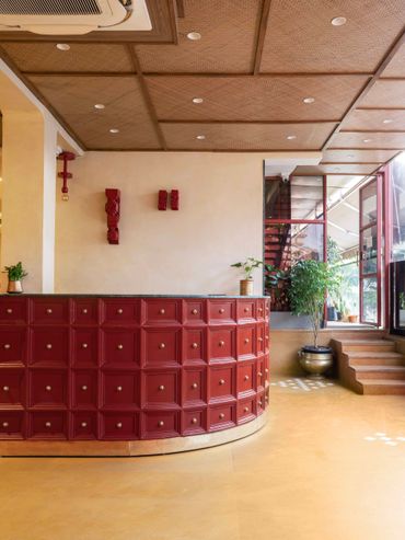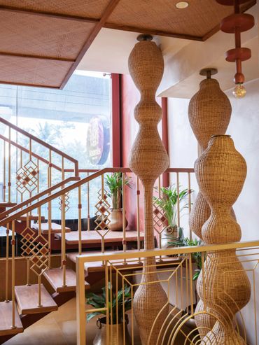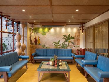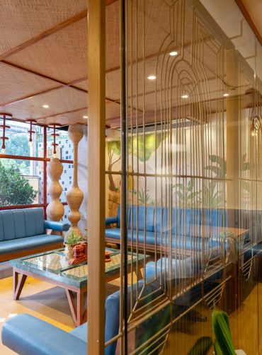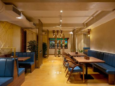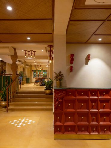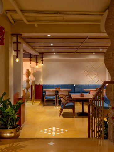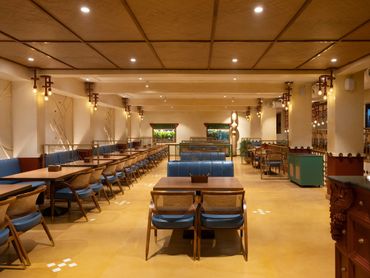 This upscale Hyderabad restaurant exhibits a modern interpretation of a traditional South Indian aesthetic with arresting design elements.This restaurant’s interiors celebrate South India’s rich traditional heritage. Highlights of the eatery include Jaisalmer yellow stone flooring, delicate brass room dividers, kolam patterned inlay walls, wooden and cane furnishings and unique decor pieces that interweave through the space. This expansive Hyderabad restaurant is divided into two levels and has a seating capacity of 200 people. The earthy material palette of the restaurant includes Jaisalmer yellow stone, wood, cane and metal.